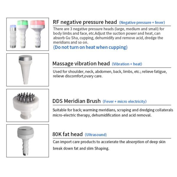 3.RF + Vacuum + Red / Blue / Green light: RF energy combined with vacuum penetrates deep skin, generating heat to accelerate metabolism, collagen contraction and regeneration, activate adipose tissue, improve blood circulation and lymphatic detox, so as to reduce fat, relieve fatigue, firm skin, reduce wrinkles, increase skin elasticity, while green light calms skin and mind, reduces skin oil secretion.